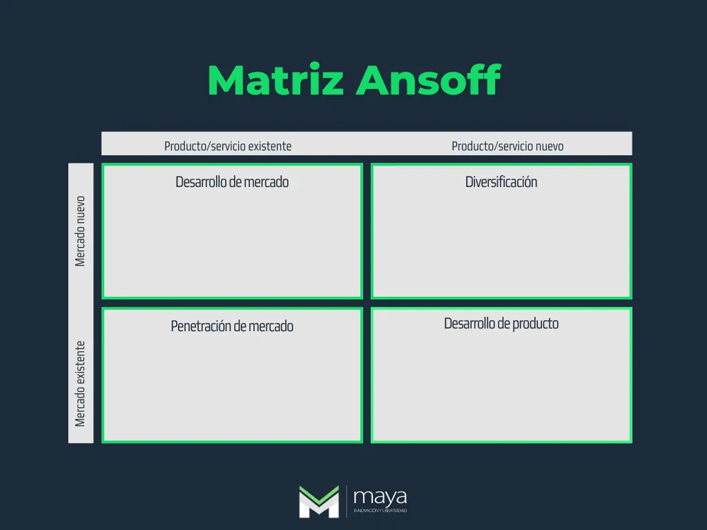 La Matriz de Ansoff es una herramienta que ayuda a las empresas a desarrollar estrategias de crecimiento, considerando dos variables clave: productos y mercados. Se exploran cuatro opciones: Penetración de Mercado (crecer en mercados actuales con productos existentes), Desarrollo de Productos (introducir nuevos productos en mercados actuales), Desarrollo de Mercados (llevar productos existentes a nuevos mercados) y Diversificación (introducir nuevos productos en nuevos mercados). Esta matriz orienta a las empresas sobre la mejor dirección estratégica para su expansión.